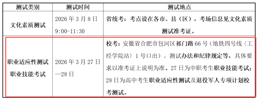 2.学校测试成绩职业适应性测试或职业技能考试成绩由我校统一发布,考生可以在2026年3月31日9:00登录安徽工业经济职业技术学院分类招生平台(网址:http://220.178.35.235:8102)查询校考测试结果,如有疑问可在2026年3月31日17:00前拨打0551-63636604进行复核。限查漏改、漏统、错统,宽严不查。