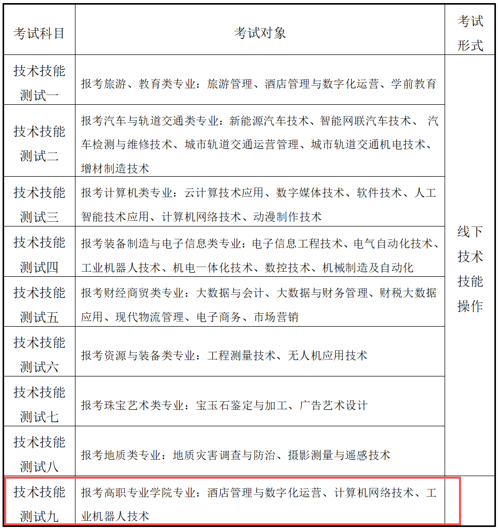 本考试大纲适用于报考安徽工业经济职业技术学院的非地质类专业的中职考生,需参加职业技能测试,包括专业能力测试和技术技能测试,两次考试都要参加,缺一不可。其中,技术技能测试共九类,请根据报考专业关注对应类别的考试大纲内容。报考各专业须参加的技术技能测试类型如下表: