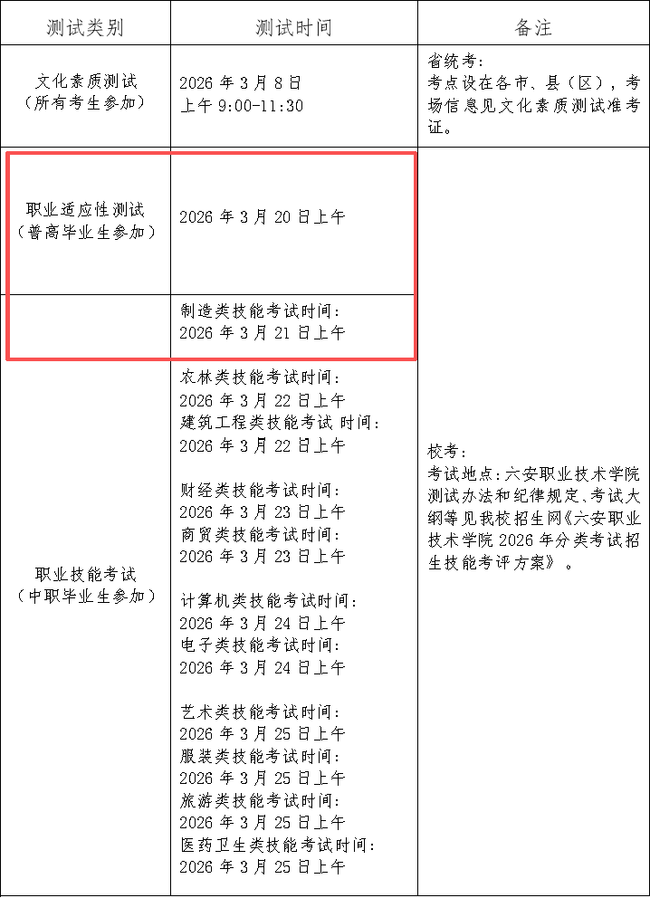 4.2026年3月20日,除中职毕业生以外的其他考生参加职业适应性测试;