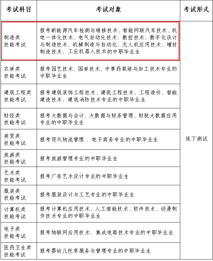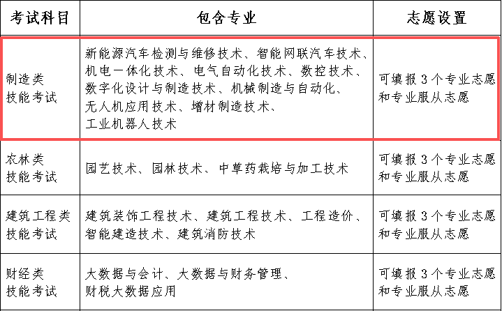 中职毕业生报考各专业须参加的职业技能考试科目见下表。